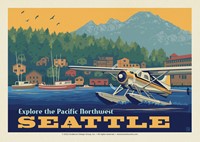 A seaplane soars over the beautiful Pacific Northwest coast of the US.