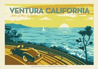 An automobile drives around a curve in Ventura, California revealing the vivid coastline below in this horizontal design.