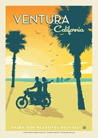 A motorcycle cruises upon the sunlit sand in Ventura Beach in this design.